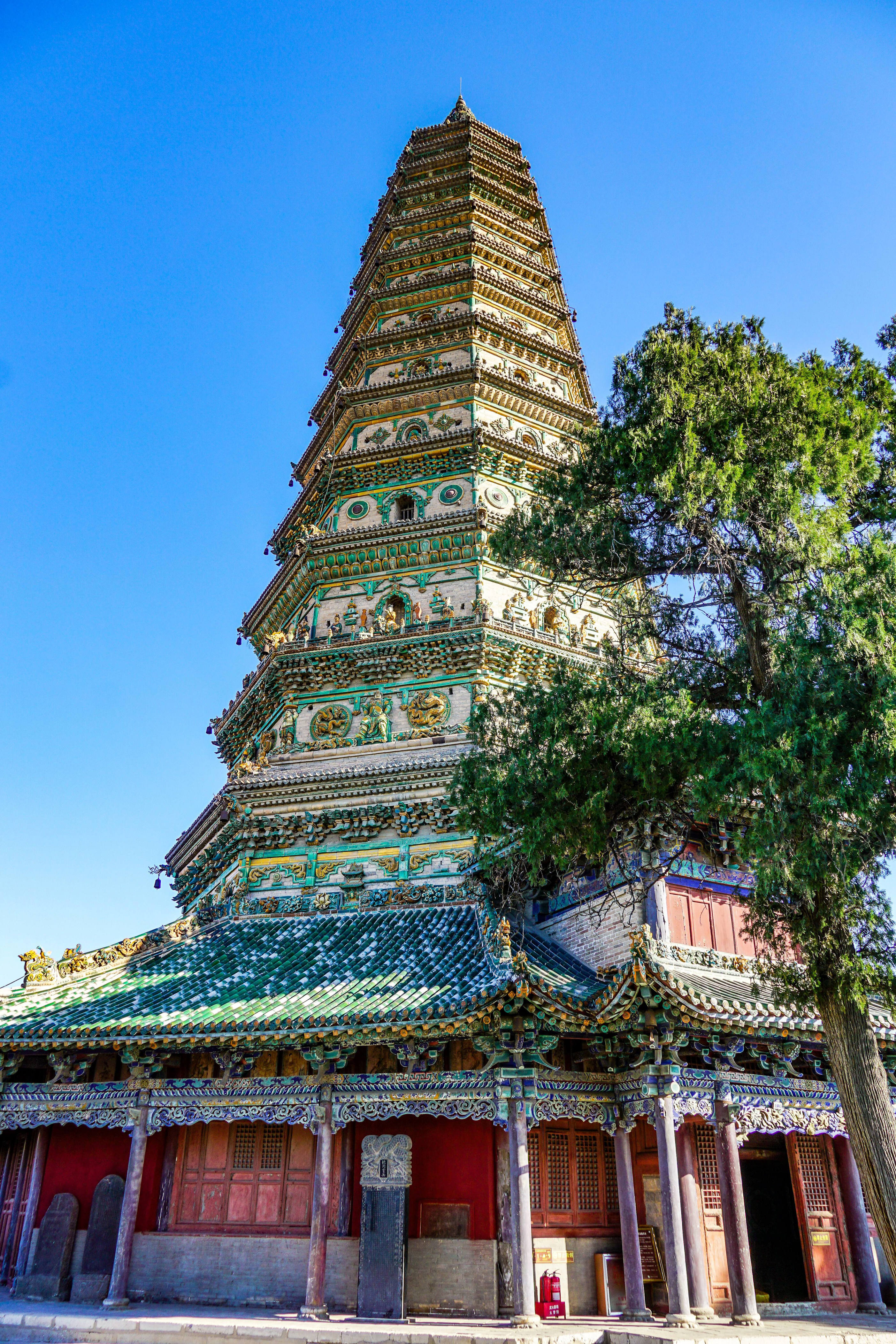 广胜寺,是一处元明古建筑群,飞虹塔、水神庙元代壁画以及《赵城金藏》为广胜寺三绝,其中飞虹塔,是现存最完整最古老的琉璃塔,也是世界上最高的多彩琉璃塔,被称为“琉璃宝塔,天下无双”,璀璨夺目。