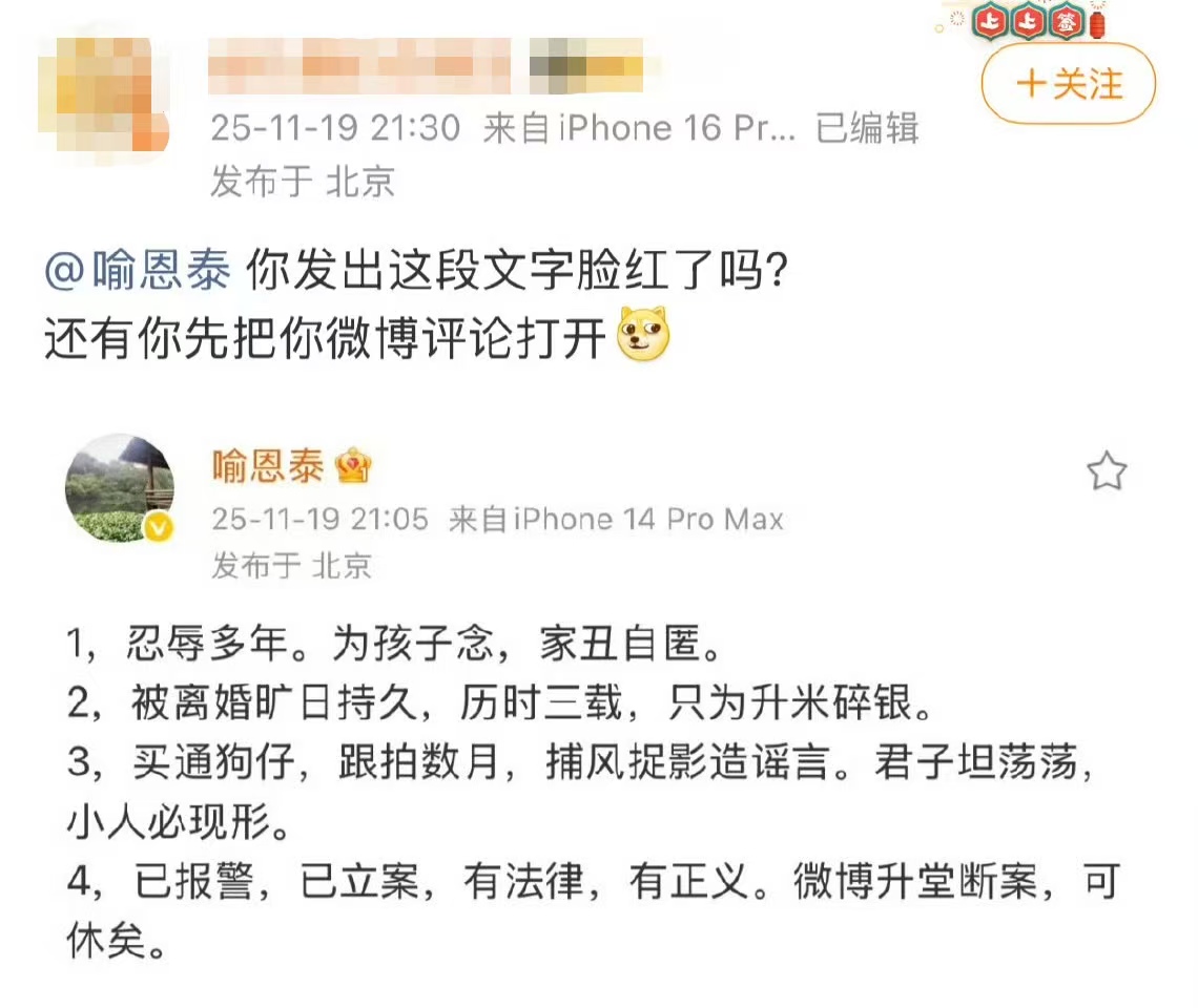面对层层争议,喻恩泰于11月19日晚发文回应,称自己“忍辱多年”,已报案走法律程序。他的回应很快遭一位长期爆料明星八卦的网友反问“你发出这段文字脸红了吗”。11月20日,喻恩泰又被曝光视频,投稿人称视频拍摄于2017年,内容为喻恩泰在KTV与一女子亲吻。