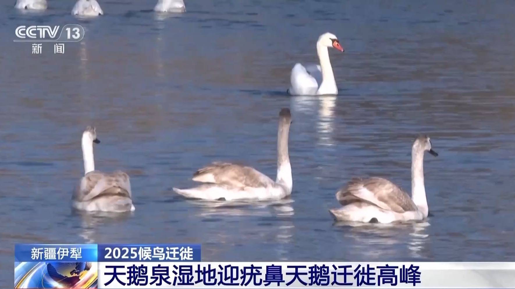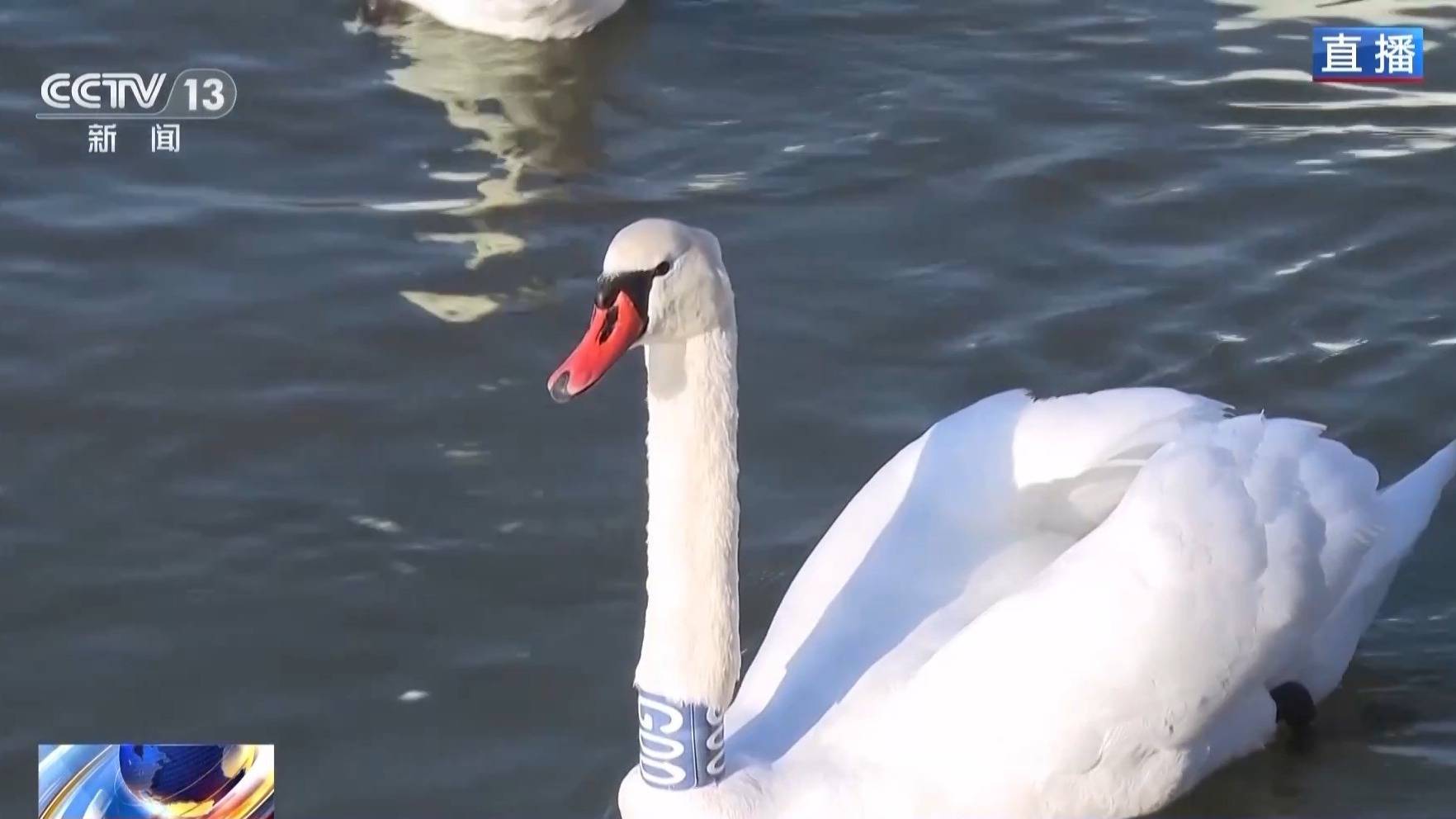 总台记者 崔宁:我现在的位置很适合观察天鹅。这段时间每天大概有三四十只疣鼻天鹅飞抵天鹅泉。到我们直播前,数量已经达到了375只,比去年同一时间多了157只。大批天鹅在一起很热闹,而且离我们非常近,根本不怕人。这也让我们的观察变得容易很多。疣鼻天鹅最大的特点是它的前额有一块黑色的瘤状突起,这也是它的名字——“疣鼻”的来源。疣鼻天鹅还有一个特点,就是声带发育不同,不像别的天鹅那样高声鸣叫,所以也被称为“哑声天鹅”。但哑声并不代表完全没有声音。