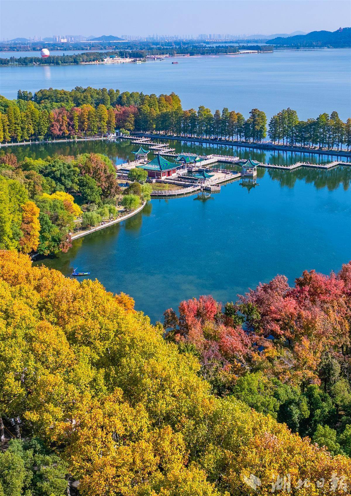11月13日,武汉东湖风景区层林尽染,红枫、乌桕、银杏等树木色彩斑斓,与亭台轩榭相互映衬,构成一幅美丽的生态画卷。